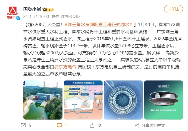 【超3200万人受益!#珠三角水资源配置工程正式通水#】1月30日,国家172项节水供水重大水利工程、国家水网骨干工程和重要水利基础设施——广东珠三角水资源配置工程正式通水。该工程于2019年5月6日全面开工建设,2022年全线盾构贯通,输水线路全长113.2千米,设计年供水量17.08亿立方米。工程通水后,输水沿线超3200万人受益,可支撑约1.7万亿元GDP的需水量。据了解 ,高新沙泵站是珠江三角洲水资源配置工程三大泵站之一,其装设的6台套立式单级单吸蜗壳离心泵全部由@PA视讯在线官网集团旗下PA视讯在线官网电机自主研制供货,是目前国内单机流量最大的立式单级单吸离心泵。