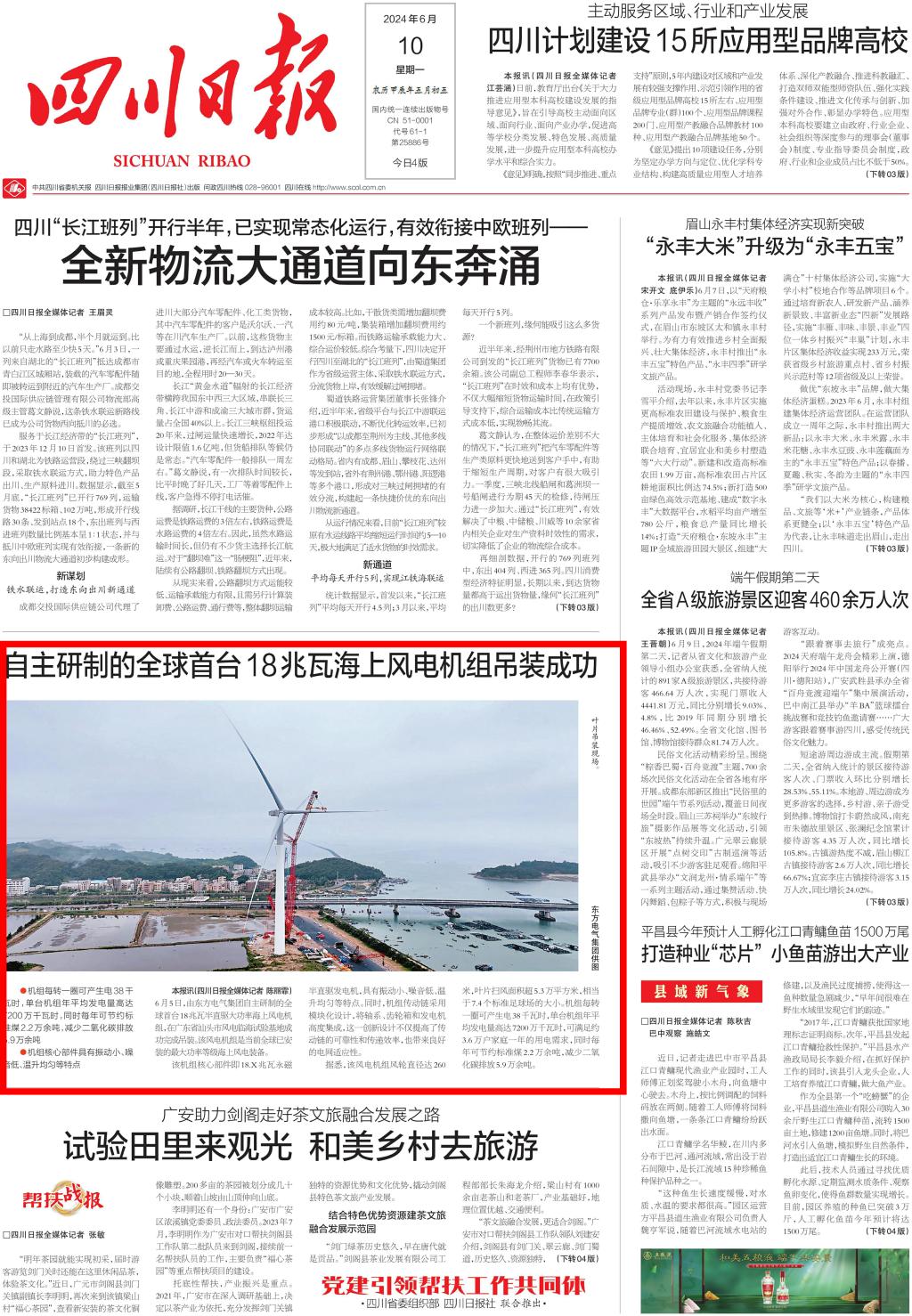 [四川日报]自主研制的全球首台18兆瓦海上风电机组吊装成功