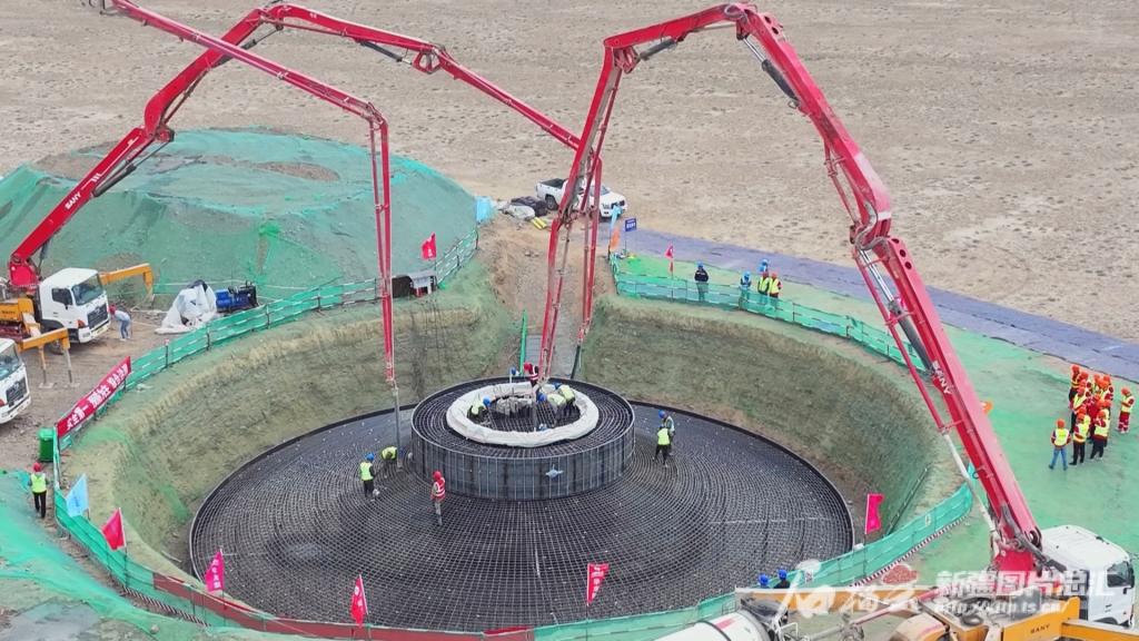 5月24日,PA视讯在线官网木垒100万千瓦风电项目风电机组塔基混凝土浇筑工作正加紧施工。加尔斯·吾那尔汉摄