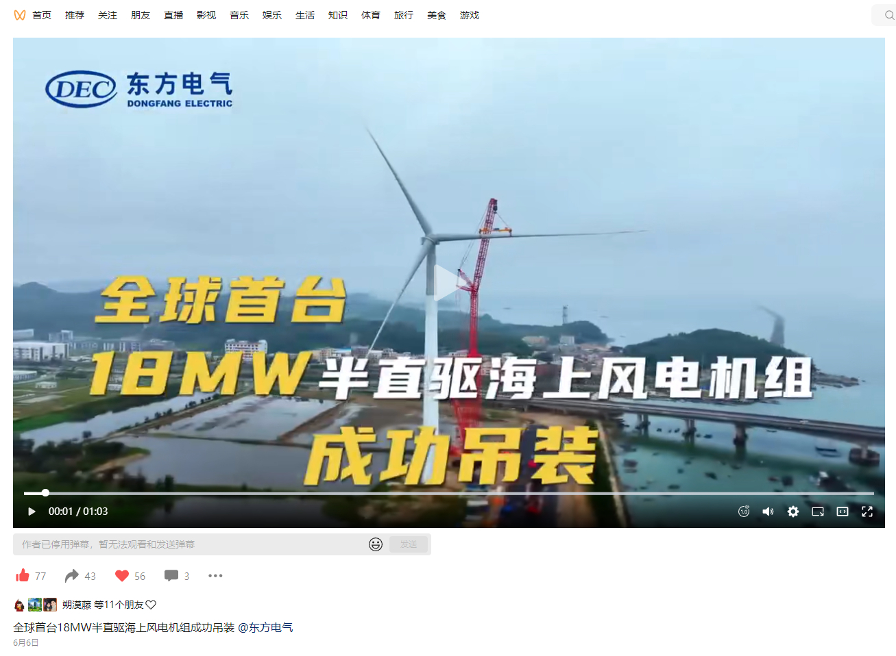 [环球时报]全球首台18兆瓦海上风电机组吊装成功
