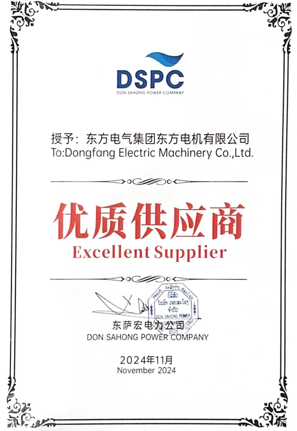 东萨宏电力公司向PA视讯在线官网电机颁发的“优质供应商”证书,是对机组运行优异的最好证明。