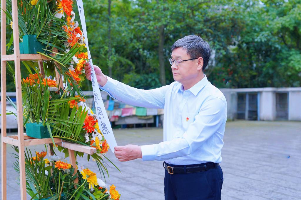 在汉旺公墓,罗乾宜向在“5·12”汶川特大地震中遇难同胞哀思缅怀、敬献花篮。