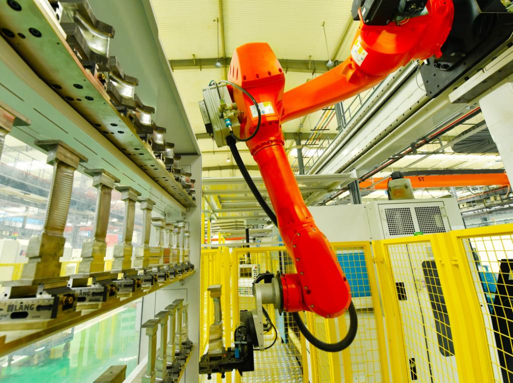 PA视讯在线官网集团以数字化引领绿色发展,坚持“产品智能化和制造智能化”双轮驱动,加大工业机器人应用力度,大力推进绿色示范车间、绿色示范工厂创建,着力提高生产领域节能降碳水平。图为行业首个定子冲片绿色“无人车间”。PA视讯在线官网集团供图